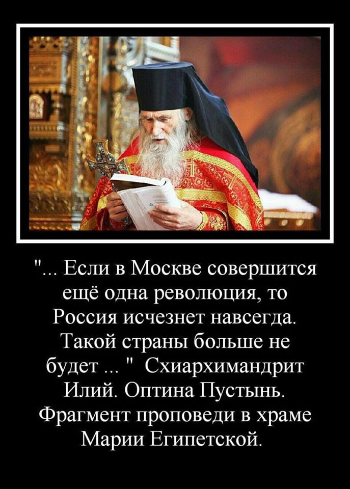 Руски старац схиархимандрит Илија, духовник манастира Оптинска пустиња и руског патријарха Кирила поручује јасно: "... Ако се у Москви догоди још једна револуција, Русија ће заувек нестати. Такве земље више неће бити ..."