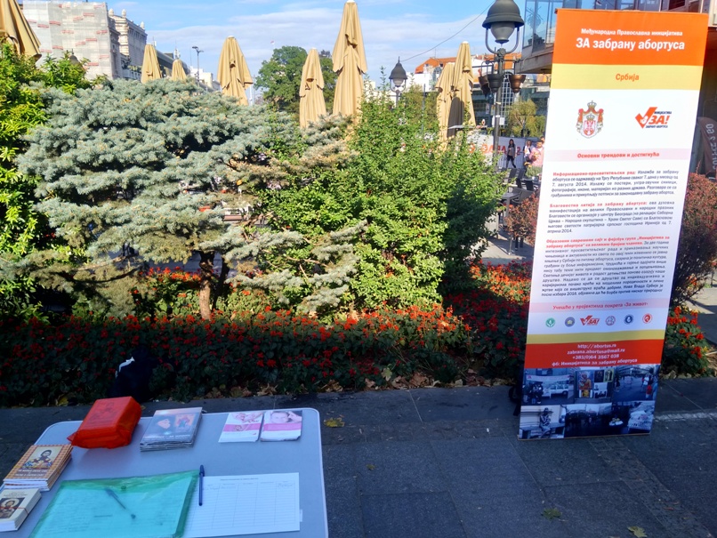 Изложба 7. октобраИзложба 7. октобра (принудно пресељена са старе локације због радова на Тргу Републике) је окупила шаролику и разноврсну екипу организатора, а исто тако и посетилаца који су се распитивали о циљу и смислу ове поставке. Научили смо већ добро да имамо пун разумевања и ширину да разумемо врло различите погледе на проблем абортуса, али да не одустајемо од својих ставова да људски живот започиње зачећем и да је абортус убиство које треба забранити као и свако друго убиство. Надамо се да ће бити у нашем друштву политичке храбрости да се ова идеја спроведе у дело.
