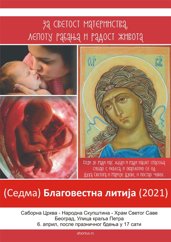 Позивамо вас на 7. Благовестну литију за рођену и нерођену децу, за очување хришћанског брака и традиционалне, природне породице, за друштво које има свој духовни имуни систем и које препознаје добро, лепо и свето. За нашу традицију, да деца могу слободно да зову своје родитеље мама и тата, за право на живот нерођене деце, за лепоту рађања и светост материнства, за већи наталитет и подршку многодетним породицама. Да млади остану у својој земљи, за Православни систем вредновања и достојанство за свакога; за само два природна пола; против истополних бракова. Да се Срби сложе, обоже и умноже! Седма Благовестна литија; Саборна црква у Београду, 6. априла увече, уочи Благовести, после празничног бдења које почиње у 17 сати. (молимо, понесите иконе)