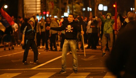 Policija je tokom nereda i posle njih u nedelju uvece na ulicama Beograda privela 179 osoba, medu kojima 48 maloletnika. U neredima je povredeno 11 gradana, 32 policajca, a osteceno je pet sluzbenih vozila i sest objekata. Prema saznanjima “Blica”, medu privedenima su navijaci Rada, Crvene zvezde i Partizana, ali u najvecoj meri pripadnici ekstremnih organizacija “Obraz” i Srpski nacionalni pokret “Nasi 1389”, ciji clanovi su pokrenuli i inicijativu za registraciju politicke partije. ![]() Slika sa ulica Beograda u nedelju uvece posle mitinga SRS