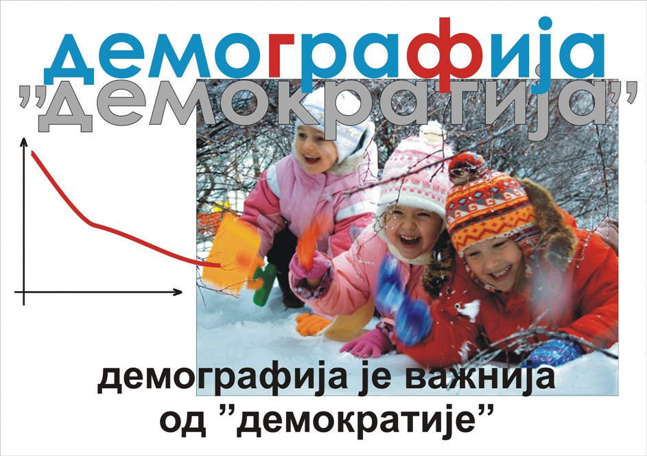 Демографија је важнија од "демократије"10.04.2013. Две деценије "демократизације" Источне Европе под диригентском палицом Америке и "Европе" (тојест Немачке, Енглеске, итд) су оставиле ужасне последице: разорене породице, демографско опадање, исељавања, депресија, полу-колонијални положај држава, беда, опадање нивоа образовања, пороци, итд. Две деценије је "демократија" била идол или полу-божанство земаља бившег комунизма, а заборављено је да без народа нема ни владавине народа (у преводу са грчког демократије). Стога је време да се манемо западних пропалих и неефикасних идеологија и да се окренемо животу народа, његовом здрављу, образовању, раду, напретку и расту броја становника - тојест заустављању процеса тихог умирања читавих народа, што се види по демографским статистикама. Стога хоћемо пројекте који имају конкретне резултате и који ће довести до тога да се више људи рађа него што умире, да буде што више деце, да буде живота у селима и градовима, дечијег плача и песме, радости и живота. То се не може постићи преко ноћи, али суморна и непријатна појава политичара са краватама који понављају отрцане снобовске фразе, а при томе немају увида у живот народа на терену мора да прође! Млади се морају максимално стимулисати да рађају, да имају троје или више деце, труднице и мајке на породиљском одсуству треба подржати и обезбедити им све што је потребно за мирно рађање и васпитавање деце. Демографија је важнија од "демократије". Деца по закону немају право гласа, али на плакату можемо видети да деца гласају за демографију. Деца не разумеју политичке манипулације, она просто хоће што више вршњака са којима могу да се играју. Деца су можда понекад мудрија од одраслих? абортус или Србија - погледајте