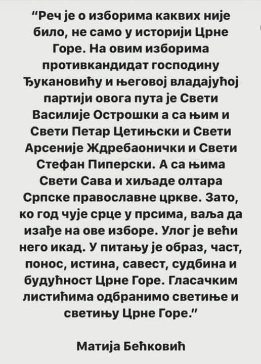 Јanuary 1 at 8:45 PM · Бијело Поље, велика литија против отимања светиња, свака част!! January 1 at 8:40 PM · Хиљаде грађана Берана на молебану, окупиле се и породице полицајаца и војника https://youtu.be/QUYQNYTX4u4 January 1 at 7:21 PM · Преносим утиске из Црне Горе: Народе Божији, ако се сабере број људи који су данас молитвено шетали: Беранама, Бијелим Пољем, Жабљаком, Никшићем, Подгорицом, Баром, Пљевљима може се рећи, да је на улици било бар 50.000 људи. Кад додамо Херцег Нови, Будву, Котор, Тиват то је бар још 15.000 људи, укупно 65.000. Онда можемо стварно да заблагодаримо Господу и да му ускликнемо пуна срца: Благодаримо вјерном народу који је показао изузетну одлучност и ријешеност да буде уз своју Цркву, одазвавши се на све позиве наших епископа на саборна окупљања. Овај народ је најљепши и најдивнији храм који се у овој духовној обнови Црне Горе саградио и обновио. Са радошћу понављамо ријечи Апостола Павла: ”Јер ви сте печат мога апостолства у Господу. То је моја одбрана пред онима који ме осуђују.” Народе Божији, свака вам част,ви сте са својом Црквом, нови исповједници Православља, чувари части и образа Црне Горе! Живјели, Мир Божији, Христос се роди!