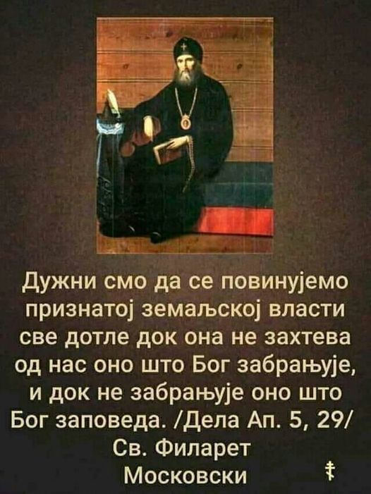 26. март · Ignaty Shestakov 25. март · Ныне силы небесные Московски Сретенски манастир Литургија Пређеосвећених Дарова Среда, 25. март 2020 26. март · Јак земљотрес који је погодио Загреб 22. марта ујутру је опомена и нама у Србији и шире. Наиме, хрватски кардинал и бискупи су у четвртак 19. марта због вируса Корона укинули, суспендовали богослужења. Након 3 дана их је задесила опомена од Бога да се то не чини. Много је наших грехова, а богослужења су им противтежа и дају глобални баланс и спречавају да нас постигне Божија казна. Уколико нема богослужења која призивају на милост Божију, онда остаје нам сам да нас постигне с… Прикажи још ZG-NADBISKUPIJA.HR Odredbe biskupa Hrvatske biskupske konferencije u vezi sa sprjecavanjem sirenja bolesti COVID-19 - Zagrebacka nadbiskupija 25. март · 0:20 / 0:40 Коментари Радојко Љубичић https://facebook.com/101461574625501/posts/203309707774020/?sfnsn=mo&d=n&vh=e 24. март · Литургије у ванредном стању: Забрана окупљања за скупове са више од 5 људи се односи на затворен простор. Литургије се могу слободно служити, и служе се, на отвореном у Црквеним портама. Могу се применити и додатне мере заштите као што су капе, рукавице, одстојање 1 метар између људи, итд. На жалост, има оних који спречавају вернике да дођу на Литургију због непостојеће забране од стране Владе. Чак и да таква забрана постоји, као што је било у време комунизма једно време, треба да знамо да постоје границе до којих поштујемо државне власти и њихове законе и наредбе. Влада нам не може наредити да променимо веру или Бога (или да их се одрекнемо), да прекинемо пост и молитву, да прекинемо Литургије и Причешћивање. Бог и Божији закон су изнад сваке земаљске власти и сваког земаљског ауторитета, закона и ситуације. Ако бисмо признали некога другог да је важнији од Бога и Јеванђеља, то би била издаја Бога и вере, као што је и била у време безбожног и анти-Црквеног комунизма. Нисмо се довољно ни покајали због те издаје, нисмо се како треба вратили Цркви. Нова, друга издаја Бога и вере би Србима и Русима вероватно била последња - после ње не би смо могли очекивати више ништа добро - само пропаст. Више немамо право на (велику) грешку. Зато, потрудимо се да нам Бог у време пандемије вируса Корона, као о увек, буде на првом месту, а онда ће све остало друго доћи на своје место. Онда ће нам се све друго брзо разјаснити и разбистрити, докле можемо да пропуштамо, а где је црвена линија који је Бог повукао и преко које се не сме ни по цену живота. Важно је да нађемо мир у душама својим, тојест да протерамо сваки страх, а поготово панику. Ако је Бог са нама, ко може против нас? 24. март · Влада би требала да осмисли како помоћи фирмама и самосталним предузетницима погођеним рестрикцијама у раду због пандемије вируса Корона. Први корак би био вероватно да се евидентирају овакве фирме и људи и да се процене њихови губитци. Боље је реаговати благовремено, него закаснело када цена отклањања негативних последица може и вероватно ће бити вишеструко већа. Да не буде поново накнадна памет. 23. март · У одбрану Светог Причешћа у свим околностима и свим временима: http://spc.rs/sr/saopshtenje_za_javnost_svetog_arhijerejskog_sinoda_4 Саопштење за јавност Светог Архијерејског Синода | Српскa Православнa Црквa [Званични сајт] SPC.RS Саопштење за јавност Светог Архијерејског Синода | Српскa Православнa Црквa [Званични сајт] Саопштење за јавност Светог Архијерејског Синода Српске Правослaвне Цркве 22. март · Дивна проповед о погрешним људским реакц