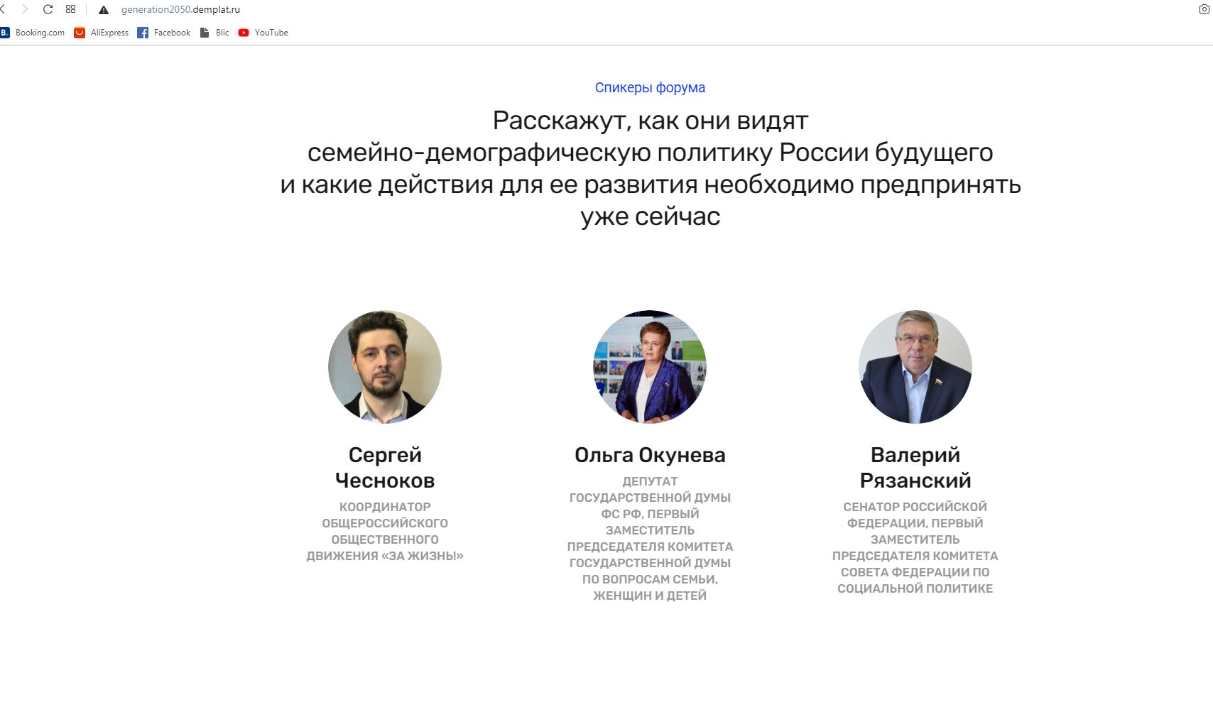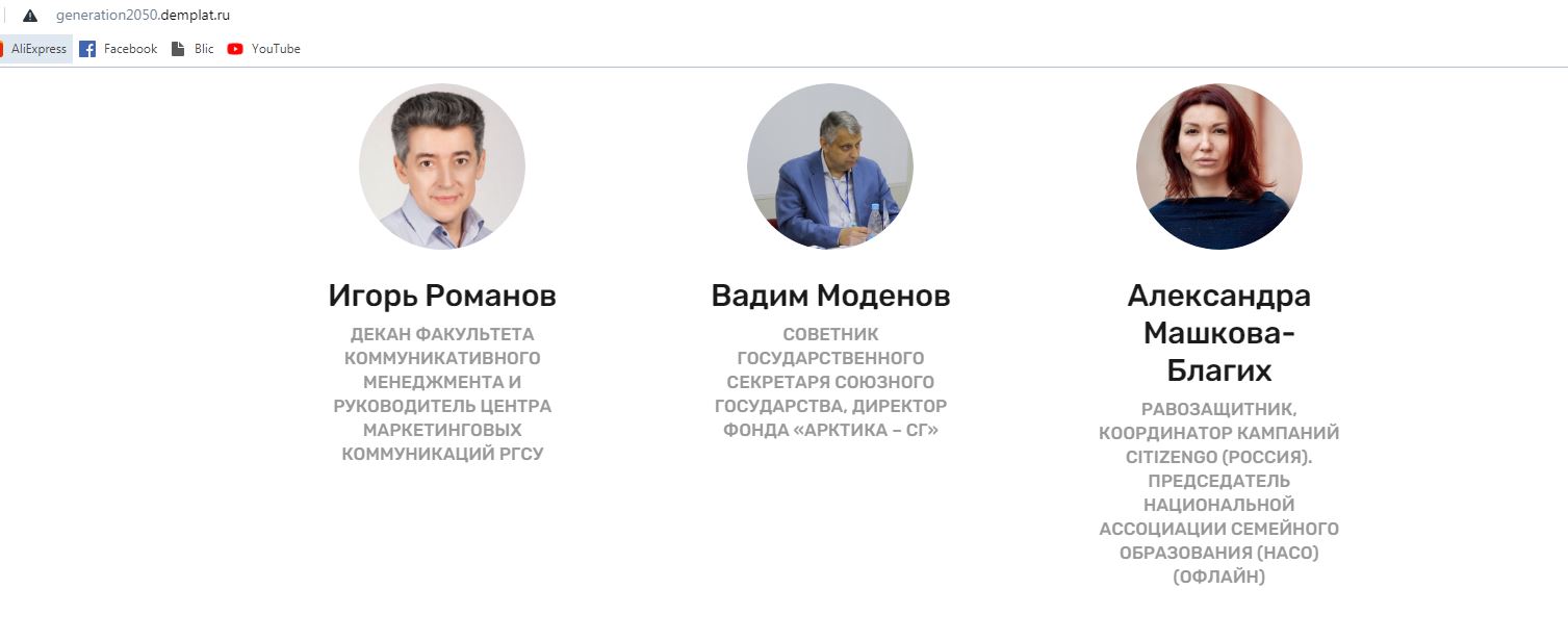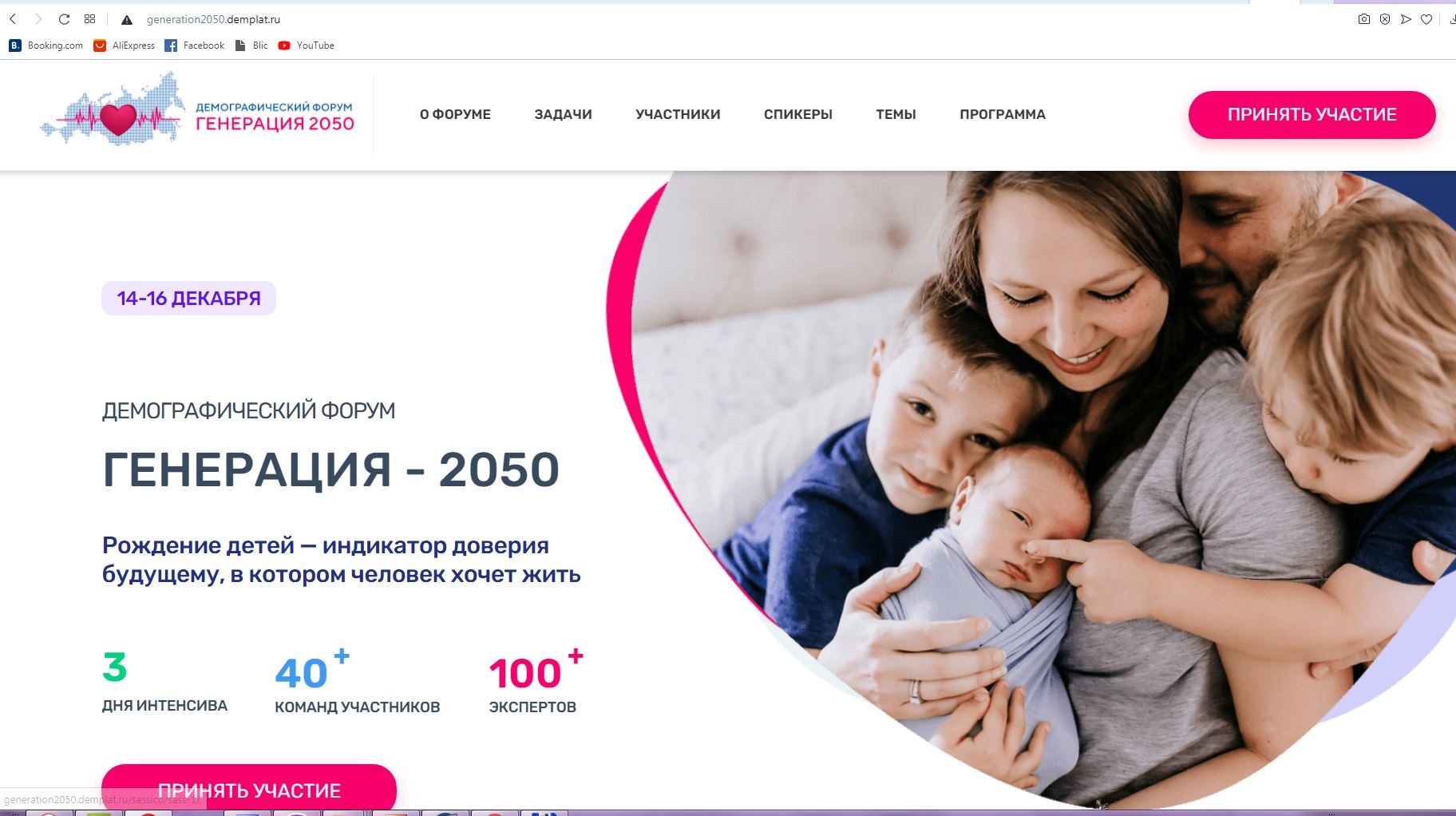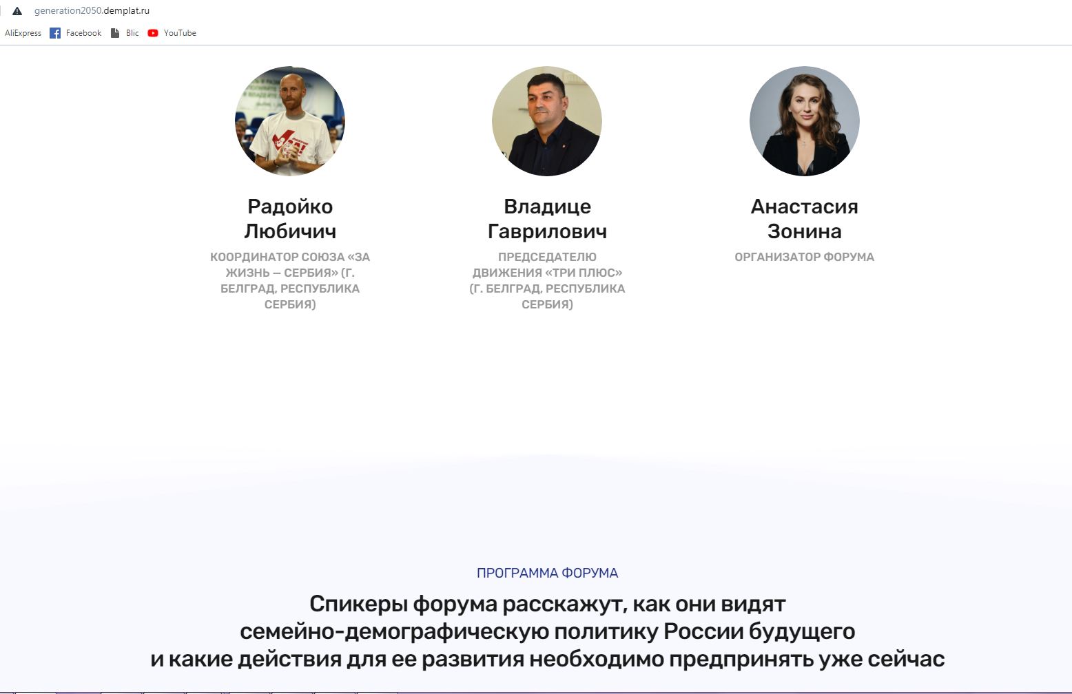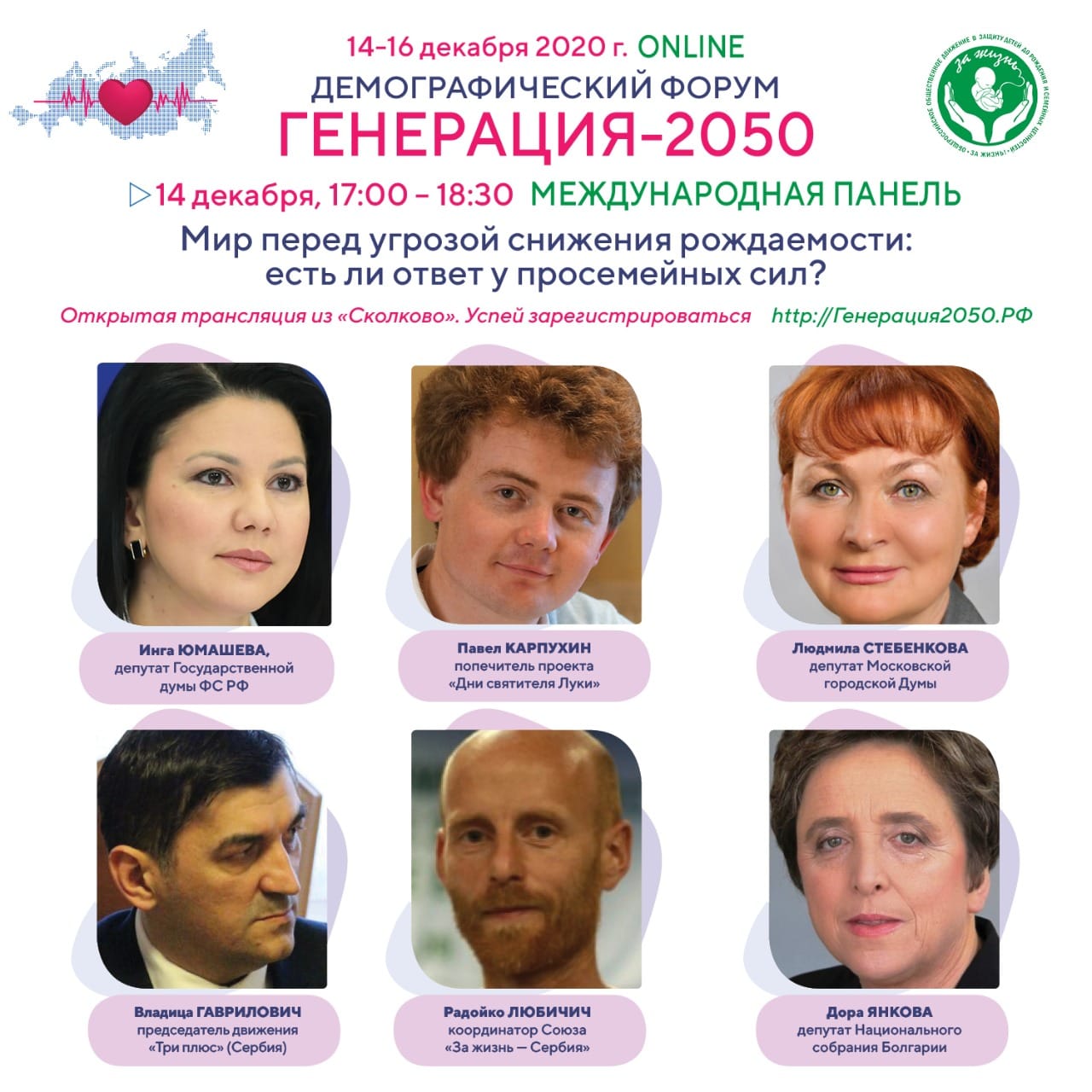 Велика руска тродневна демографска конференција "Генерација 2050" у Москви од 14. до 16. децембра. Конференција је он-лајн, водитељ међународног панела је депутат (посланик) Инга Јумашева. Директан пренос, стриминг на youtube у понедељак 14. децембра преко линка, наш панел је од 3 сата по нашем времену: https://youtu.be/8KM90t1cs0M Центар транслације првог дана је Технопарк Сколково, један од највећих и најмодернијих научних центара Русије.