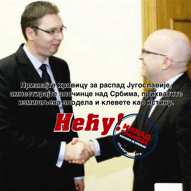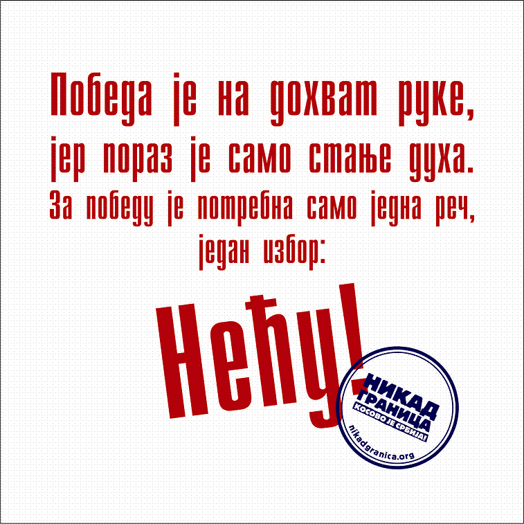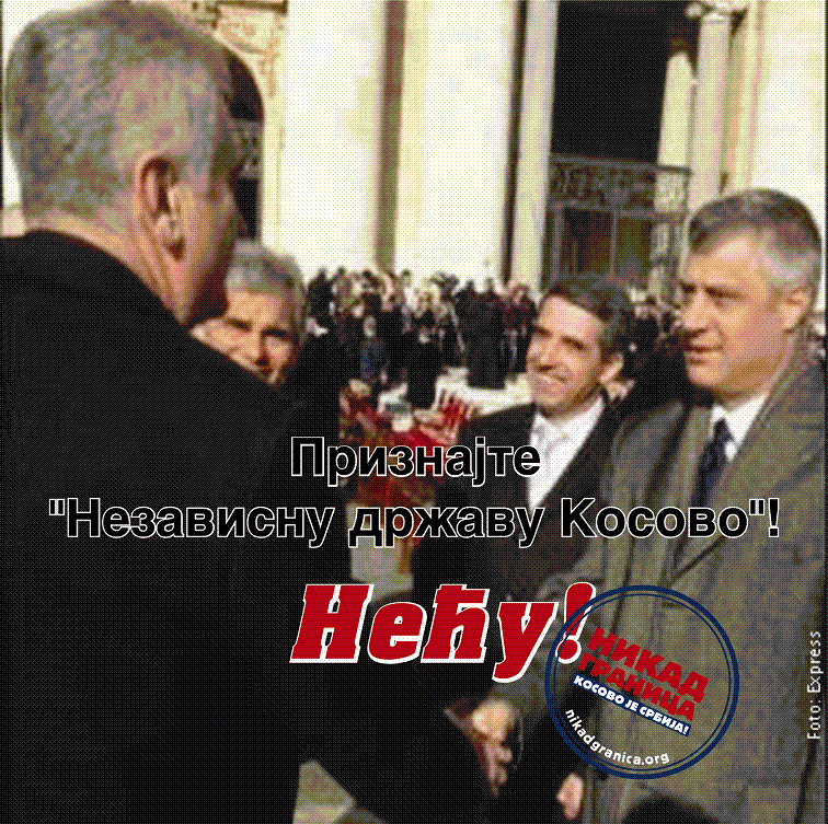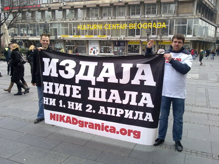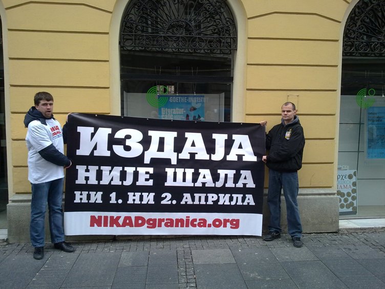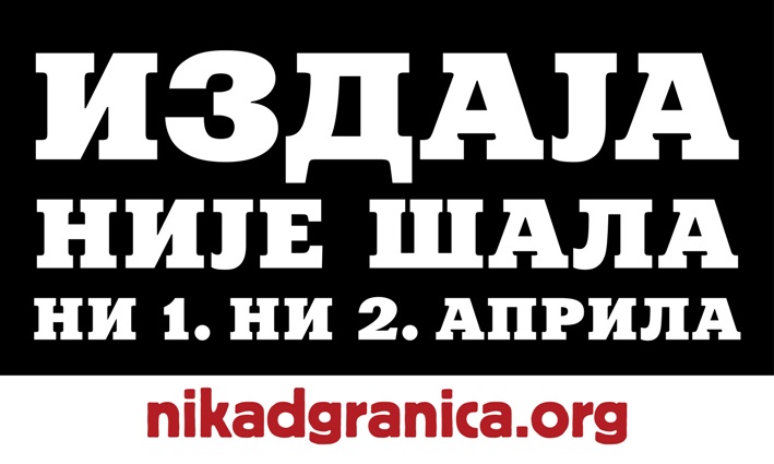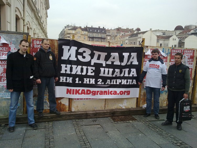 Издаја није шала29.03.2013. / 01.04.2013. Најава: Иницијатива Никад граница ће у понедељак 1. априла организовати акцију "Издаја није шала". На овај начин желимо као савесни грађани Србије да помогнемо високој државној делегацији Србије да се што боље припреми за (како сами кажу) веома тешке преговоре у Бриселу. Преговарати у Бриселу је не само тешко него и бесмислено - каква је логика преговарати са албанским терористом Хашимом Тачијем у граду где је седиште НАТО алијансе која нас је бомбардовала пре 14 година? каква корист може бити од тога по било кога у Србији? Пошто је уобичајено да се 1. април обележава као дан шале и разних досетки, треба властодршце подсетити да издаја није шала и да никаква јефтина страначка демагогија неће моћи да превари народ Србије - бриселски предлози су неприхватљиви! Ако неко покуша да потпише независност Косова и Метохије у Бриселу - боље да се у Београд не враћа! Србија има снаге да се брани и да примерено санкционише злочин удруженог политичког против-државног (против-уставног) деловања. Позивамо вас на окупљање и разговор у понедељак 1. априла код Руског цара у 13 сати. Живела Србија!