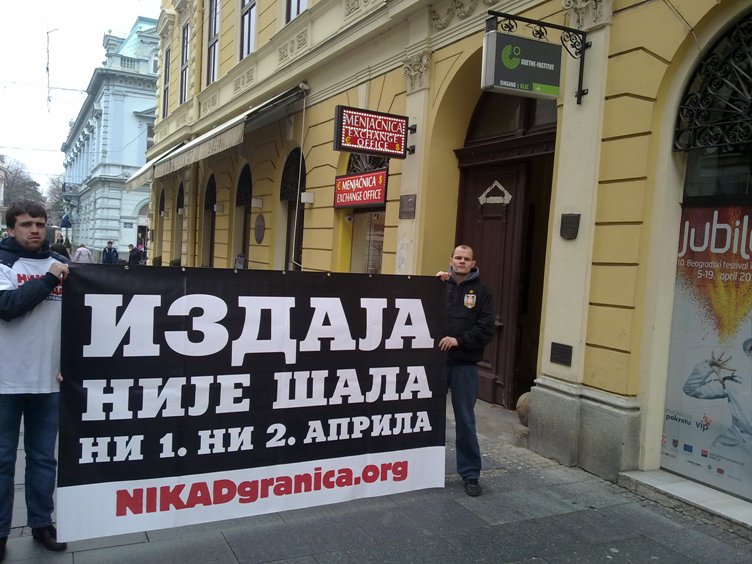 http://nikadgranica.org/izdaja-nije-sala-ni-1-ni-2-aprila-video-fotografije/#more-949 Активисти 1389 са транспарентом "Издаја није шала" испред Немачког културног центра "Гете института":