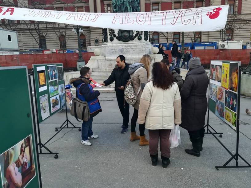 Лепота и богатство различитости (7. март 2018.) Одржана је данас још једна изложба за забрану абортуса на Тргу Републике у Београду у оквиру кампање: сваки 7. дан у месецу - дан деловања за живот и децу и против абортуса. Било је врло занимљиво са мноштвом људи различитог узраста, образовања, вредности, животних искустава и ставова. Трудили смо се да испоштујемо сваког и одговоримо на сва лака и тешка питања. Настављено је прикупљање потписа за забрану абортуса уз посебну подршку родитеља са малом децом, који најбоље осећају ужас могућности прекида трудноће и не рађања детета кога Бог шаље у свет.