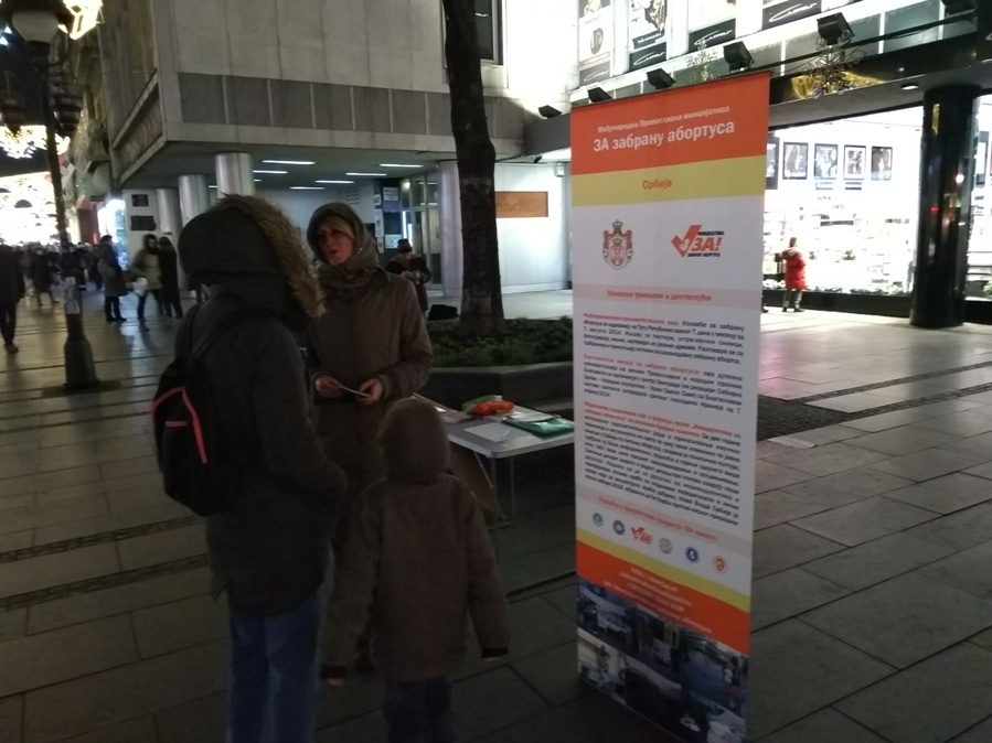 Децембарска изложба 9.12.2018. Прохладни 7. децембар је поново прилика за разговор са грађанима и прикупљање потписа у оквиру иницијативе за заштиту женског психо-физичког здравља, за заштиту деце од тренутка зачећа, за позитиван природни прираштај, за хуманије друштво, односно, свеукупно: за забрану абортуса. Хвала свим волонтерима који су по хладном времену делили радни материјал и промовисали кампању у центру Београда. Активности се настављају у координацији са другим домаћим и страним (про-лајф) удружењима у области заштите људског живота и породице.