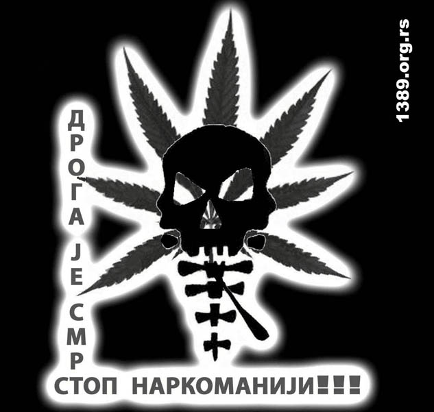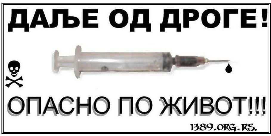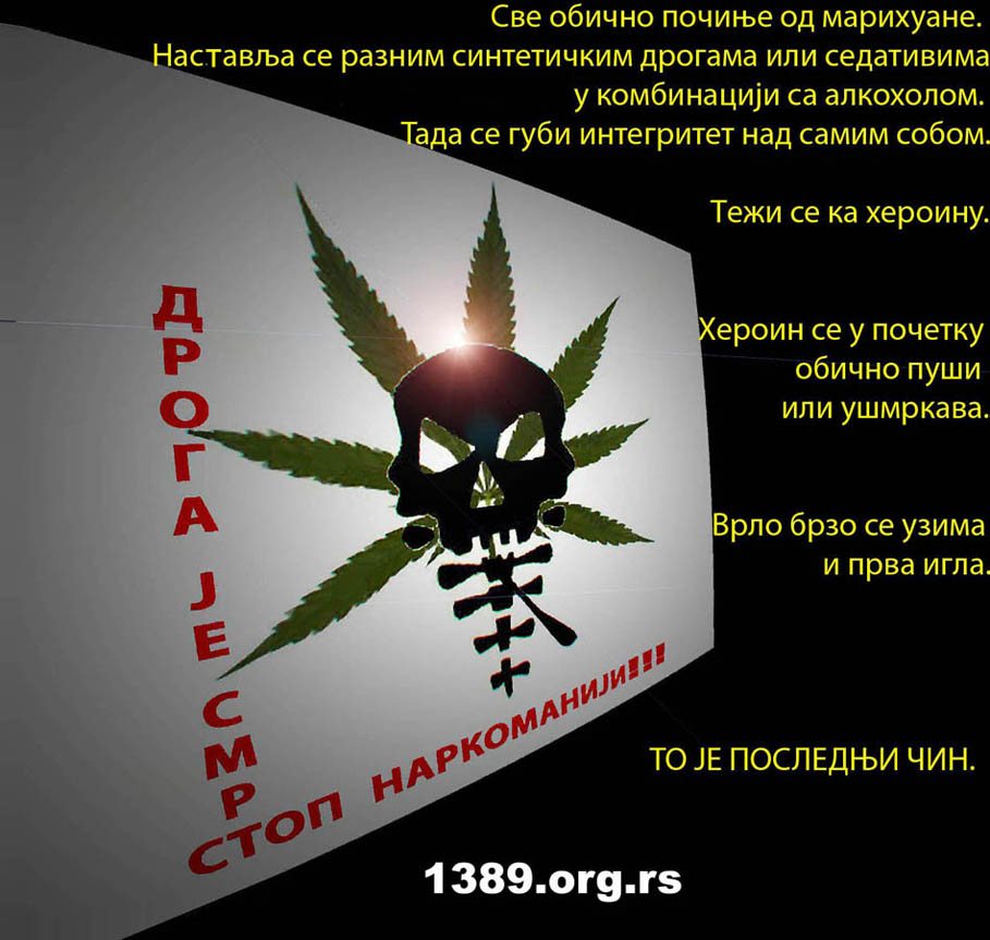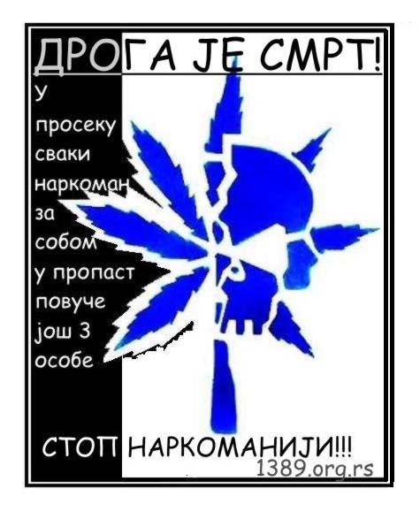 Материјал за кампању против дрогеКренимо сви заједно у борбу против зла званог дрога које уништава многе животе у Србији и свету, потрудимо се да спречимо стварање нових зависника и да помогнемо онима који су се већ уплели у смртоносну мрежу наркотика. Не смемо бити равнодушни према наркоманији, не смемо затварати очи пред овим проблемом, образујмо своје суграђане, сународнике да препознају опасност.