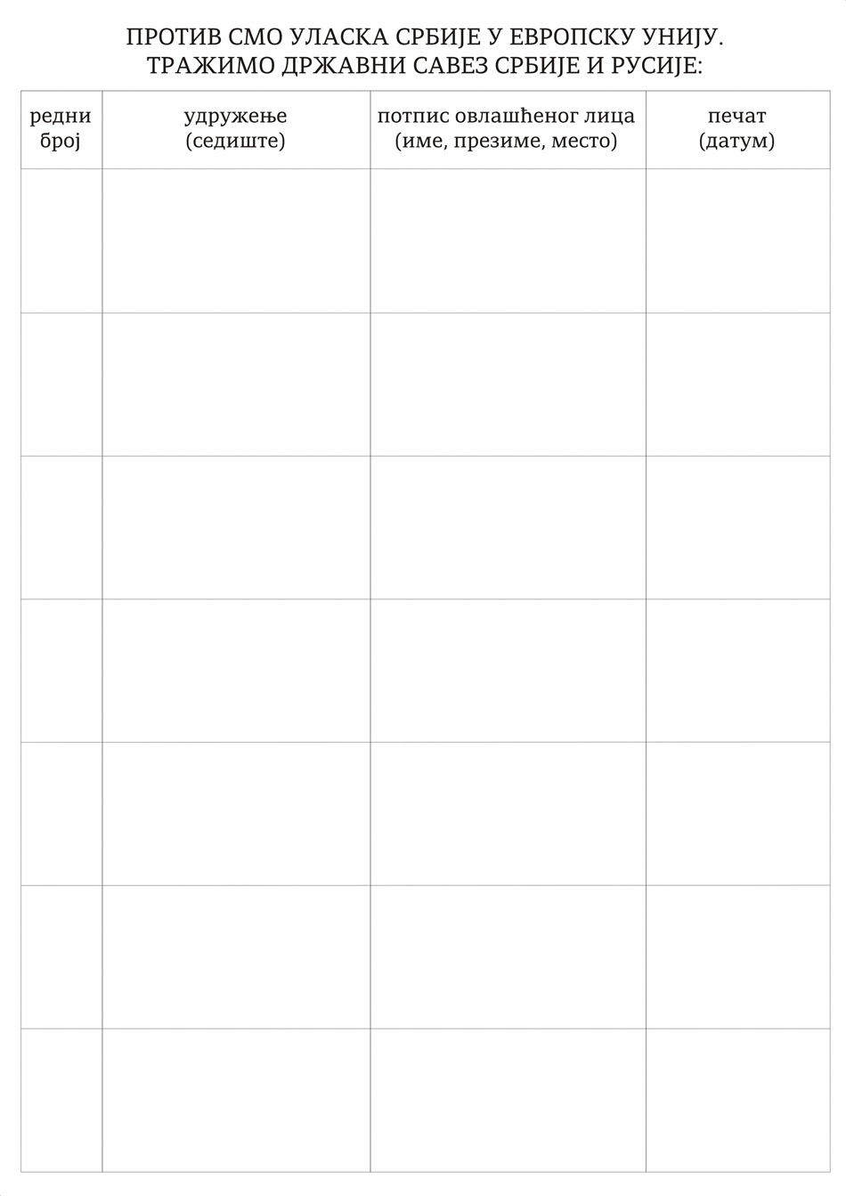Образац кампање "Не ЕУ, за државни савез Србије и Русије"(Молимо сва удружења која подржавају кампању, да преузму и одштампају приложени образац, попуне га а затим да скенирају испуњен образац и пошаљу на електронску пошту покрета 1389: jedan389@yahoo.com Телефон за обавештења је: +38164 902 1312 ) повратак на претходну страницу - овде