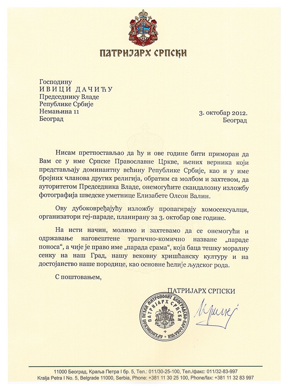 Господину 3. октобар 2012. Нисам претпостављао да ћу и ове године бити приморан да Вам се у име Српске Православне Цркве, њених верника који представљају доминантну већину Републике Србије, као и у име бројних чланова других религија, обратим са молбом и захтевом, да ауторитетом Председника Владе, онемогућите скандалозну изложбу фотографија шведске уметнице Елизабете Олсон Валин. Ову дубоковређајућу изложбу пропагирају хомосексуалци, организатори геј-параде, планирану за 3. октобар ове године. На исти начин, молимо и захтевамо да се онемогући и одржавање наговештене трагично-комично назване „параде поноса“, а чије је право име „парада срама“, која баца тешку моралну сенку на наш Град, нашу вековну хришћанску културу и на достојанство наше породице, као основне ћелије људског рода. С поштовањем, ПАТРИЈАРХ СРПСКИ И Р И Н Е Ј