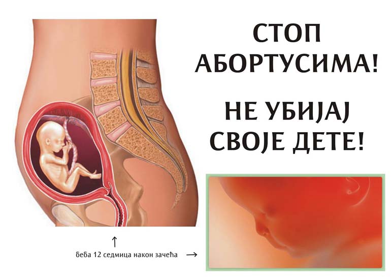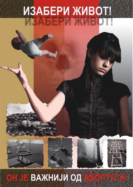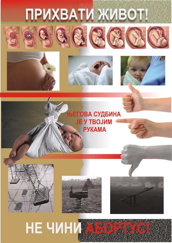 Почиње кампања против абортуса05.01.2011. Почетком јануара 2011. (уочи Божића) започиње, са Благословом Патријаршије Српске православне цркве (линк), друштвена кампања против абортуса (утробних чедоморстава) и беле куге. Кампања ће се у почетку реализовати кроз израду и расподелу едукативног материјала. Циљ кампање је подизање свести, првенствено младих, о ризицима, контраидикацијама, психолошким и друштвеним последицама намерног прекида трудноће, тојест абортуса. Црква нас учи да живот настаје у тренутку зачећа - празник Христовог зачећа Благовести, се слави 9 месеци пре празника рођења Христовог - Божића. Сви који желе да учествују у овој кампањи и помогну борбу против биолошког изумирања српског народа, могу се јавити путем електронске поште: jedan389@mail.ru или телефонске линије: 064 902 1312. Изведена акција: Плакатима против абортуса - детаљније Застакљени плакати на јавним местима - детаљније Ево радне верзије плаката кампање против абортуса:
