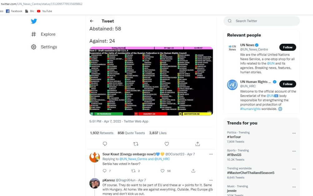 Гласање "Србије" против Русије у УН (16 кратких пунктова) 10.4.2022. Заузимањем става против Русије у УН под притиском западних дипломата, медија итд српски политичари показују непромишљеност, недостатак храбрости и знања, итд, што све укупно може на крају скупо да нас кошта. Ево неколико чињеница и закључака, које треба имати у виду: