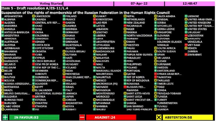 13. Искључивање било које земље из Савета УН за људска права је лоше по људска права у свету и нема оправдање. Свака земља света има право да буде присутна у овом телу, да изнесе своје податке, погледе на проблеме, своја тумачења догађаја, итд. Овим се наговештава да грађани Русије немају људска права у пуном обиму и смислу, зато што су обележени као агресори. Никакве оптужнице нити пресуде не могу да укину људска права.