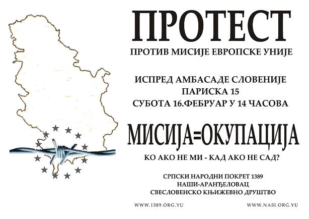 ПРОТЕСТ ПРОТИВ МИСИЈЕ ЕВРОПСКЕ УНИЈЕ ИСПРЕД АМБАСАДЕ СЛОВЕНИЈЕ "МИСИЈА=ОКУПАЦИЈА"