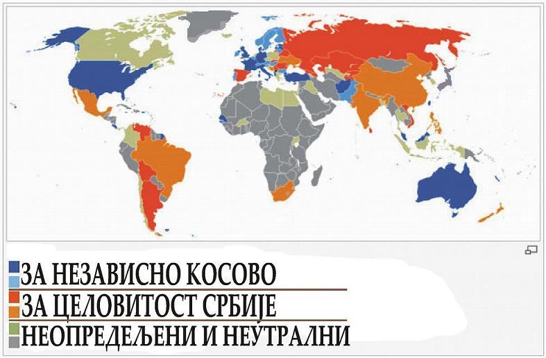 земље које подржавају целовитост и суверенитет Србије упркос притиску западних сила (већина човечанства):1. Русија (17 милиона км квадратних) 2. Кина (1,3 милијарде становника) 3. Индија (1,1 милијарди становника) 4. Грчка 5. Румунија 6. Венецуела 7. Молдавија 8. Кипар 9. Белорусија 10. Шпанија 11. Словачка 12. Јужноафричка република 13. Бразил (190 милиона становника) 14. Индонезија (240 милиона становника) 15. Шри Ланка 16. Казахстан (2,7 милиона км квадратних) 17. Нови Зеланд 18. Аргентина, 19. Боливија, 20. Азербејџан, 21. Грузија, 22. Вијетнам, 23. Либија, и друге земље (хвала вам од срца)