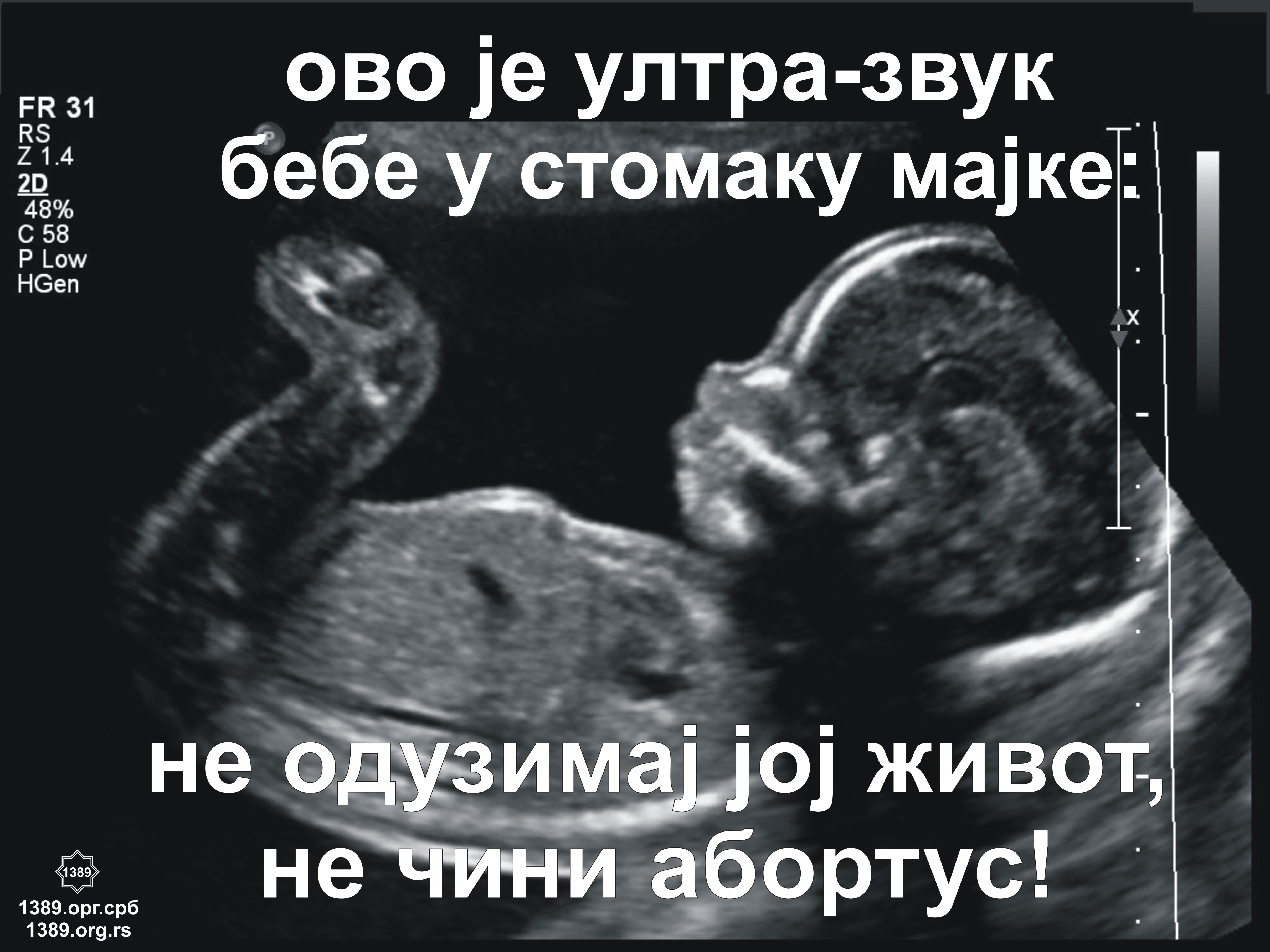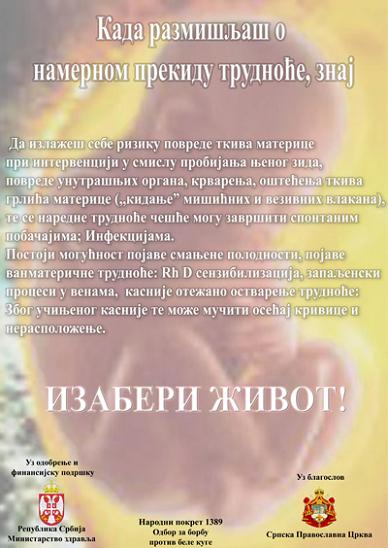 Развој бебе у стомаку мајке (фото) - улаз Развој бебе у стомаку мајке (видео) - улаз Откуцаји срца бебе у мајчином стомаку - улаз Зашто је абортус злочин? (фотографије)- улаз Резултати нашег истраживања - улаз "Светиња живота", др Витомир Перић - улаз ... са Благословом Оруђа за извођење абортуса - улаз Плакати кампање против абортуса - улаз Aбортуси и европеизација убијају Србију - детаљније
