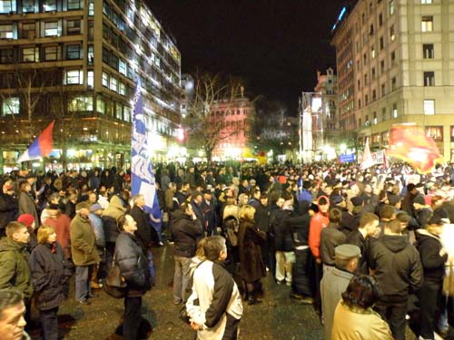 Поново се показало да се вером и вољом може много урадити и без великих фондова и донација. Промишљеном и пожртвованом кампањом привучен је велики број људи на обележавање 10-огодишњице НАТО бомбардовања. Неколико хиљада људи је већ неколико минута након 18 часова испунило Трг републике. Скуп је отворио хор студената Београдског универзитета песмама на српском и руском језику. Након тога је прочитана молитва за спас српског народа, што је већ традиција свакодневних окупљања на Тргу републике. Зачуле су се и химне Србије и Русије као најбоља потврда државотворности скупа и поништавања евро-атлантских интеграција. Присутни су здушно поздравили Сашу Ходоровског, делегата наше братске организације, руског удружења НАШИ, који је истакао приврженост руске омладине својој српској браћи, жал због злочина који су се десили насупрот међународном праву пре 10 година, али и нужност знатног појачавања међусобне сарадње што је жеља оба народа. На жалост, велики део програма нисмо били у стању да изведемо због бројних сметњи које смо претрпели, па и физичких напада провокатора које је наша редарска служба некако обуздала. Полиција је овога пута лоше одрадила свој посао: скоро ништа на безбедности скупа није урађено, неке учеснике скупа Полиција је безразложно претукла након скупа, али зато бесмислене пријаве и тужбе се против Покрета 1389 редовно подносе судовима. Ближи се крај евро-атлантског режима. Други део скупа, након 19 часова организовао је Народни покрет Србије. Захваљујемо свима који су присуствовали скупу или помогли његово организовање.