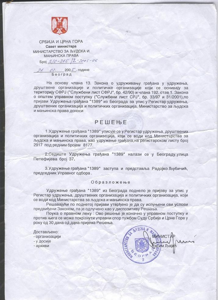 Регистрација удружења 21.02.2005. године